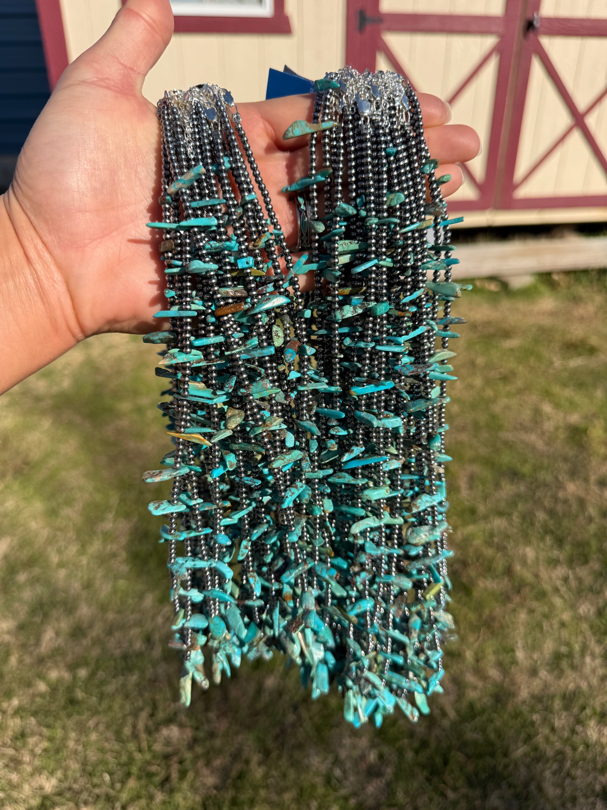 This gorgeous 25-inch necklace blends 3 mm sterling silver pearls with long blue turquoise beads for a fun, stylish Southwestern look. The longer length makes it perfect to wear on its own, or layered with your favorite strands. Every necklace is created with natural turquoise, so each one has its own unique layout and personality. Finished with sterling silver findings and a 2-inch extender so you can adjust the fit just how you like.